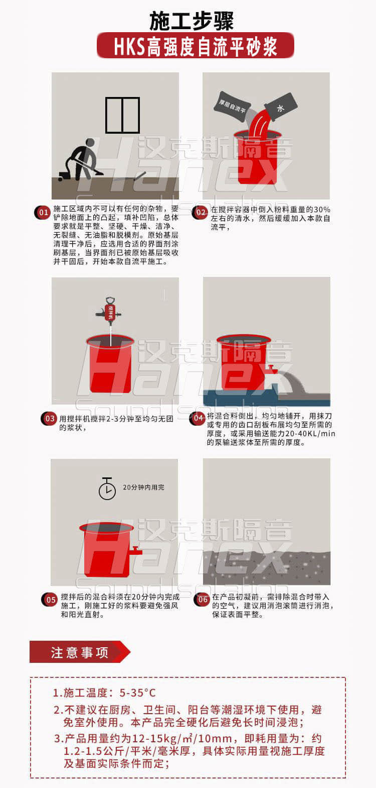 1.自流平砂漿加水量為35+2%,無(wú)需添加其他任何成份,先將水放入攪拌桶,再倒入自流平砂漿,用電動(dòng)攪拌器攪拌2-5分鐘,應(yīng)充分?jǐn)嚢杈鶆?br/>