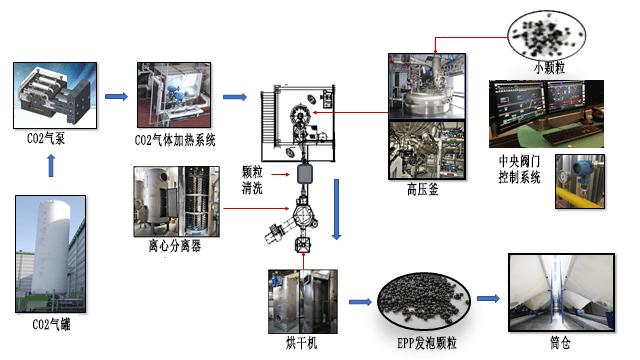 Epp材料生產(chǎn)所使用到的設(shè)備包括二氧化碳?xì)獗煤蜌夤蕖怏w加熱系統(tǒng)、高壓釜、離心分離器、中央控制系統(tǒng)、烘干機(jī)、筒倉等。大致的作用可看上圖。